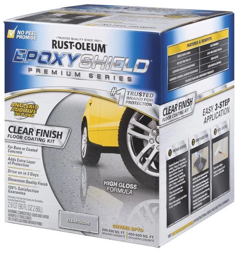 Rust-Oleum EPOXYSHIELD 90 oz. Premium Clear Coating adds a high-gloss protective finish to coated or bare concrete surfaces. Apply it for excellent wear, impact and abrasion resistance to heavy foot and vehicle traffic areas such as garages, industrial areas and more. This kit includes a 2-part clear coating, an anti-skid additive, a stir stick and detailed instructions for easier application.
