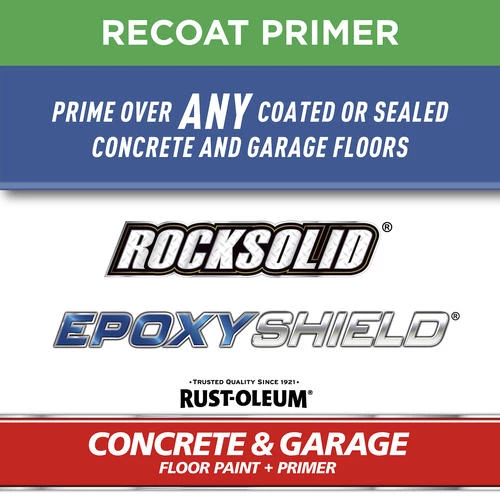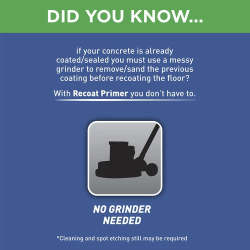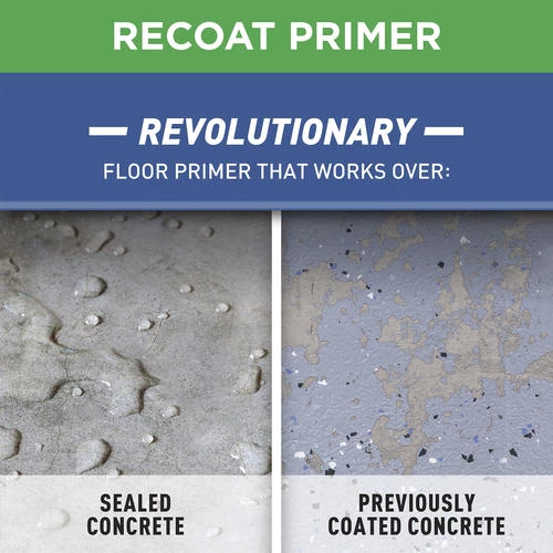 If your sealed or previously coated floor is wearing down or if you just want to update the look of your current floors, Recoat Primer is the perfect solution. Recoat Primer is an easy to use, revolutionary technology which allows you to coat over previously coated or sealed concrete without having to scuff, sand, or grind the surface. Transform your worn garage or basement floor with any floor coating (including water and solvent base). Simply Clean, Prime, & Coat!
