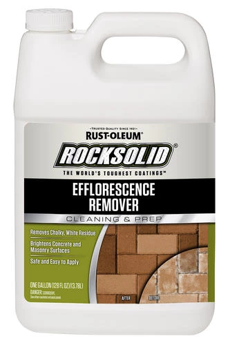 Rust-Oleum® RockSolid® Efflorescence Remover removes white, chalky residue and mild rust stains found on concrete and masonry. You can use it on bare concrete.