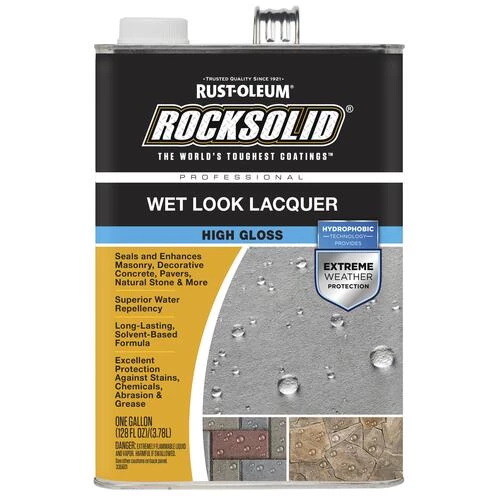 Rust-Oleum RockSolid High Gloss Wet Look Lacquer seals and protects concrete and masonry, extending the life of your concrete. This solvent-based formula is suitable for use on driveways, patios, and walkways, adding a “wet look” finish to the surface.