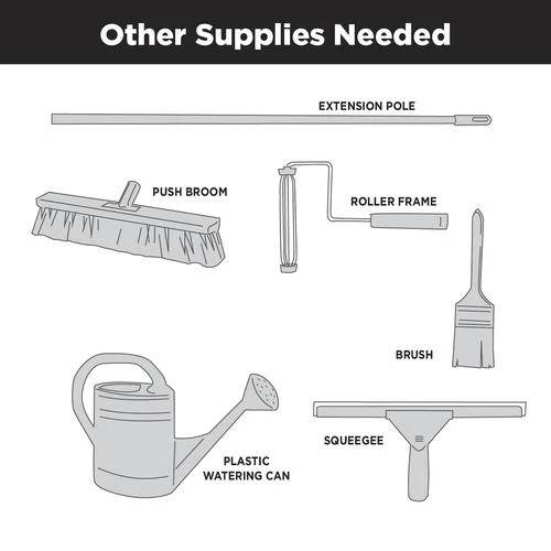 - Kit includes polycuramine pouch, foam roller, decorative chips, concrete etch, and instructions