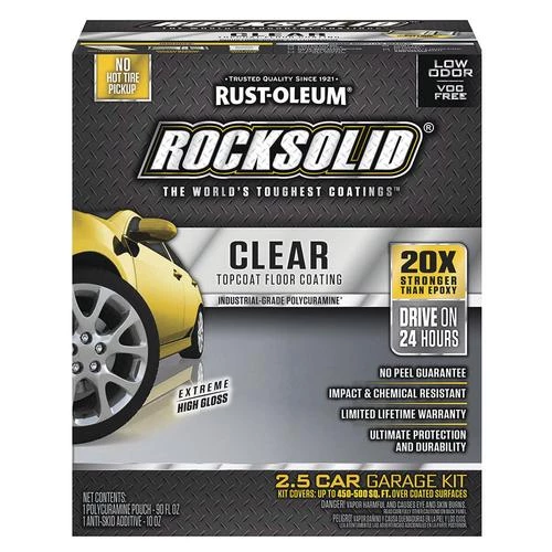 RockSolid® Polycuramine Clear Top Coat is a clear high gloss protective coating that is formulated to offer unsurpassed durability. It is 20 times more durable than epoxy, ensuring it won’t crack or peel and providing resistance to salt, oil, gas, and other harsh chemicals. Zero VOCs make it a great choice for indoor applications, especially when minimal to no odor is a must. RockSolid® Polycuramine Clear Top Coat is recommended for the handyman’s shop floor, professional garages, and other high traffic locations. The kit covers 250 square feet over bare concrete or 500 square feet over coated concrete.