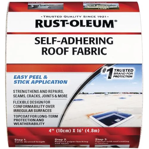 Rust-Oleum Self-Adhering Roof Fabric is a professional grade tape for roofing repairs and reinforcement. Easy to use flexible adhesive tool covers and strengthens areas that cause leaks including cracks, seams and joints. Roof patch fabric can be cut to fit for repeated use and works over existing roof coatings, asphalt, metal, wood, masonry and more.