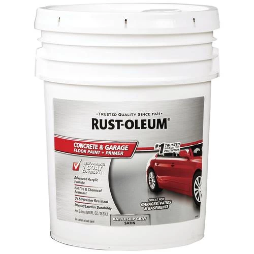 Rust-Oleum Concrete and Garage Floor Paint is a self-priming concrete floor paint that saves time and resists damage from hot tires, motor oil, grease and gasoline. Requires only one coat, dries to a satin finish and is ready for light foot traffic after 12-16 hours and normal foot traffic in 24 hours.