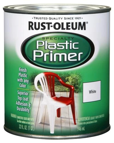 Plastic Primer is designed to prepare plastic surfaces to be top coated with any Rust-Oleum® color or finish. This primer is ideal for use on polypropylene, polystyrene, resin, PVC, fiberglass and vinyl plastic items such as chairs, tables and planters. Some plastics made of polyethylene are manufactured in such a way that may hinder paint adhesion. Test this product on an inconspicuous area to test for compatibility on the surface.