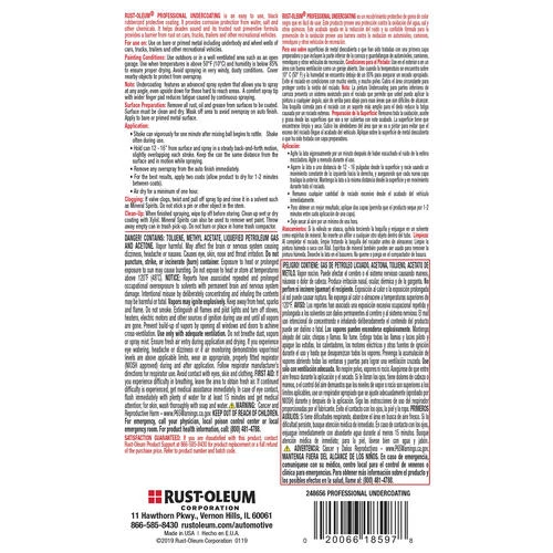 Rust-Oleum® Professional Undercoating is an easy-to-use, black, rubberized coating. Provides corrosive protection from water, salt, and other chemicals and helps deaden sound. With its trusted rust-preventive formula, this spray provides a barrier from rust on cars, trucks, trailers, and other recreational vehicles.